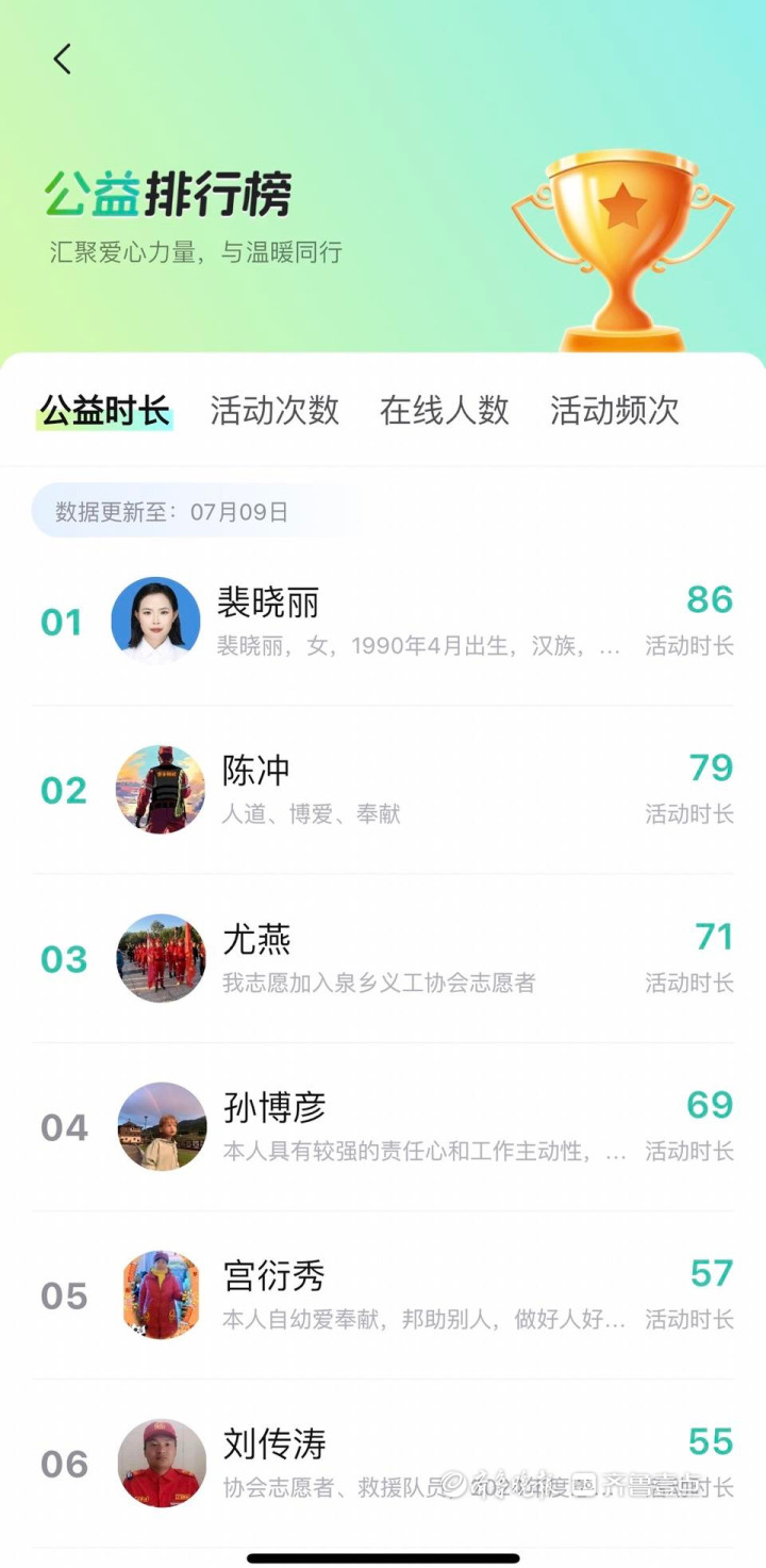 看着自己的排名随着志愿时长的增加而上升,或是看到其他优秀志愿者的突出表现,都会激励用户更踊跃地参与公益活动,让每一份善意都能在排行榜上留下印记,也让用户感受到自己的付出是有价值、有意义的。